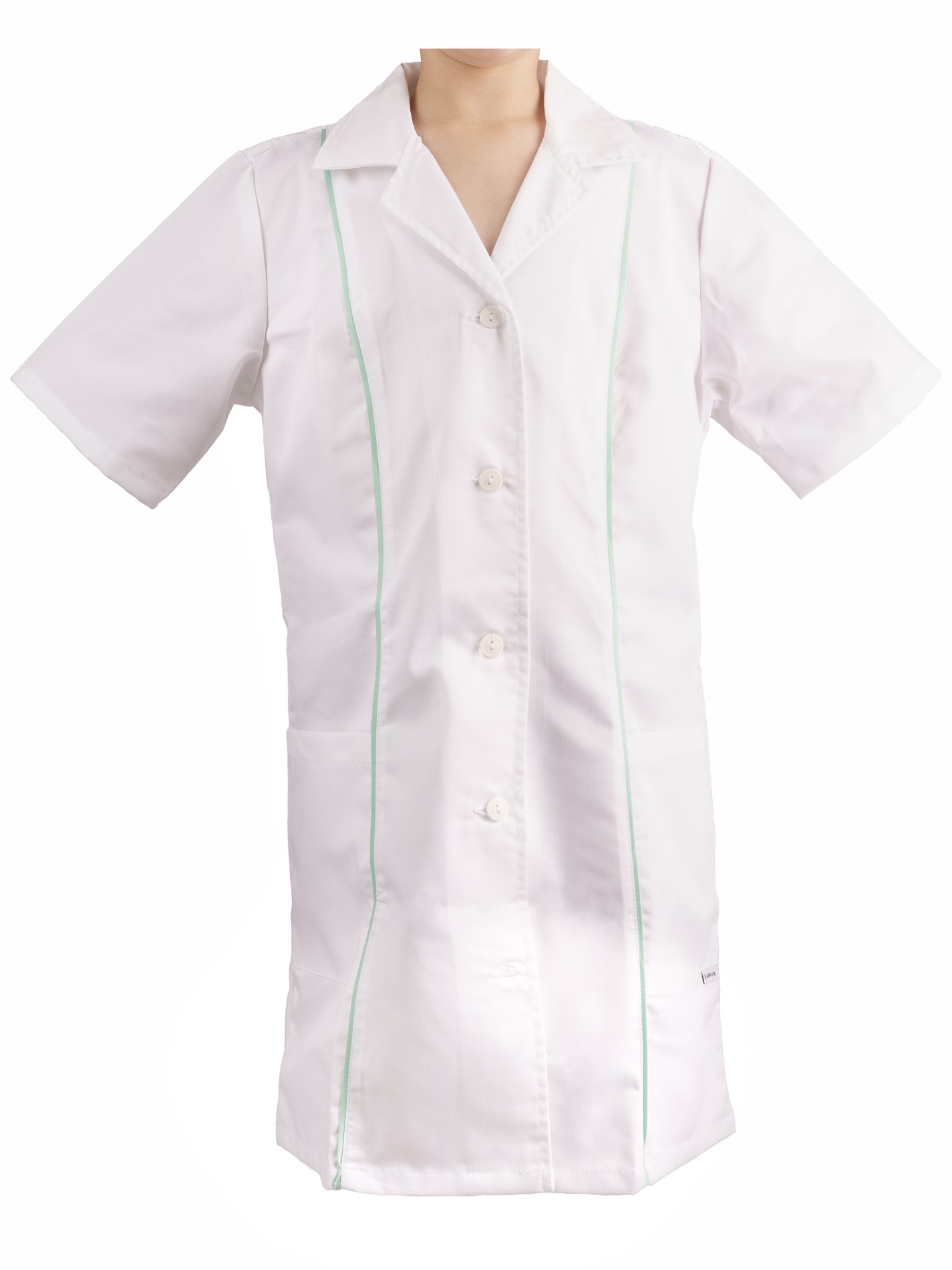 Dámská halena se zapínáním na knoflíky v bílé barvě doplněná světle zelenou saténovou paspulkou, založené rukávy, na zadní straně dragon