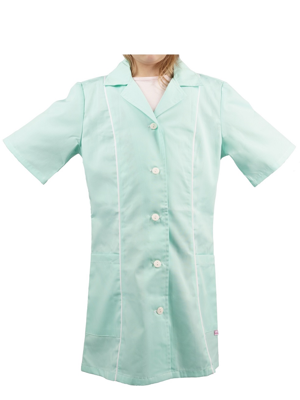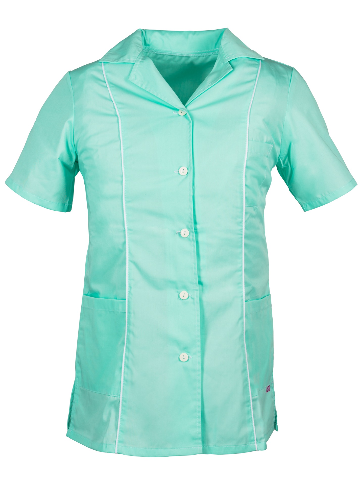 Dámská halena se zapínáním na knoflíky v mentolové barvě doplněná bílou paspulkou, založené rukávy, na zadní straně dragon