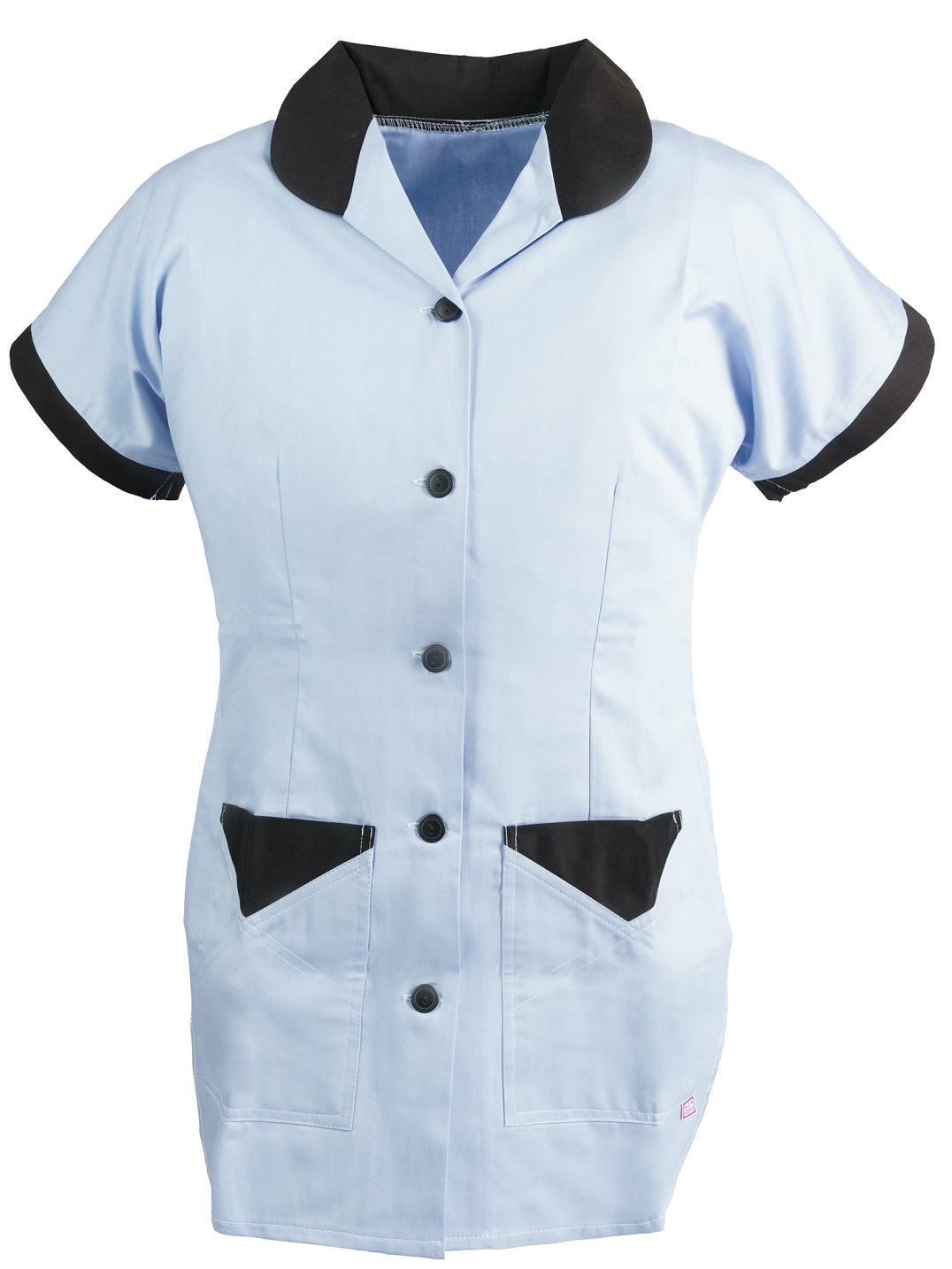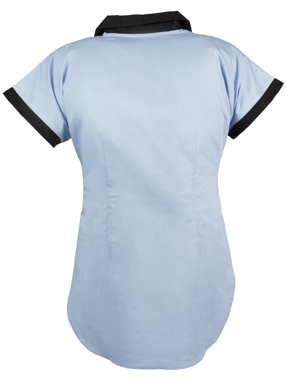 Dámská světle modrá halena s ozdobným límcem, manžetou na rukávu a kapse, zapínaní na knoflíky, na spodním díle zakončená rozparky